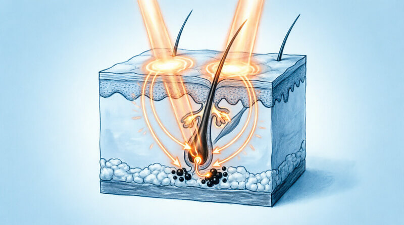 IPL delivers pulses of broad-spectrum light into the skin, targeting pigment and blood vessels beneath the surface.